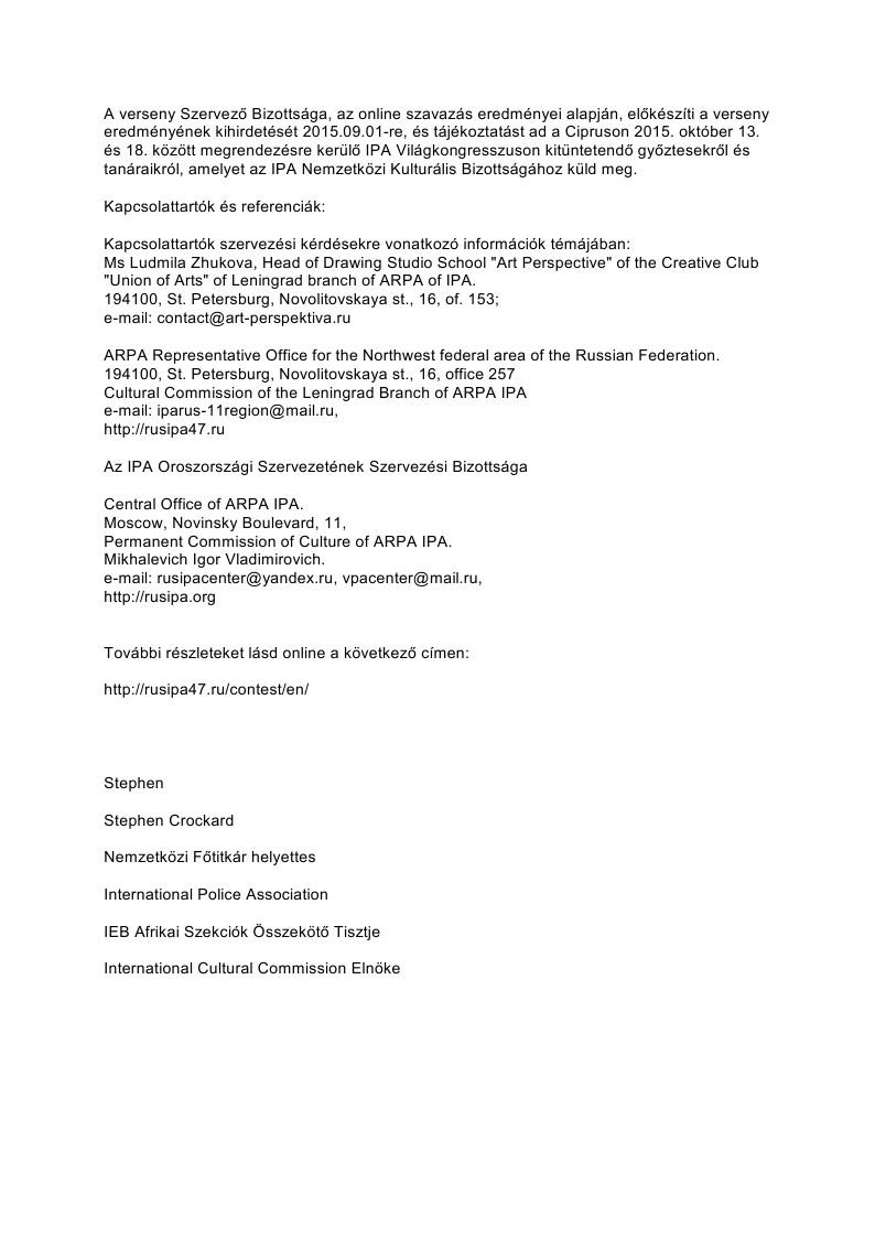 Az Alelnök Asszonnyal egyeztetve kérnénk Önöket, hogy erre az e-mail címre küldjék el a beszkennelt pályázatokat és a kitöltött, aláírt nyilatkozatokat, hogy egyben át tudjam küldeni a nemzetközi bizottság által megadott e-mail címre. Ezért kérem szíveskedjenek 2020. augusztus. 28, 12:00 óráig megküldeni az > címre.